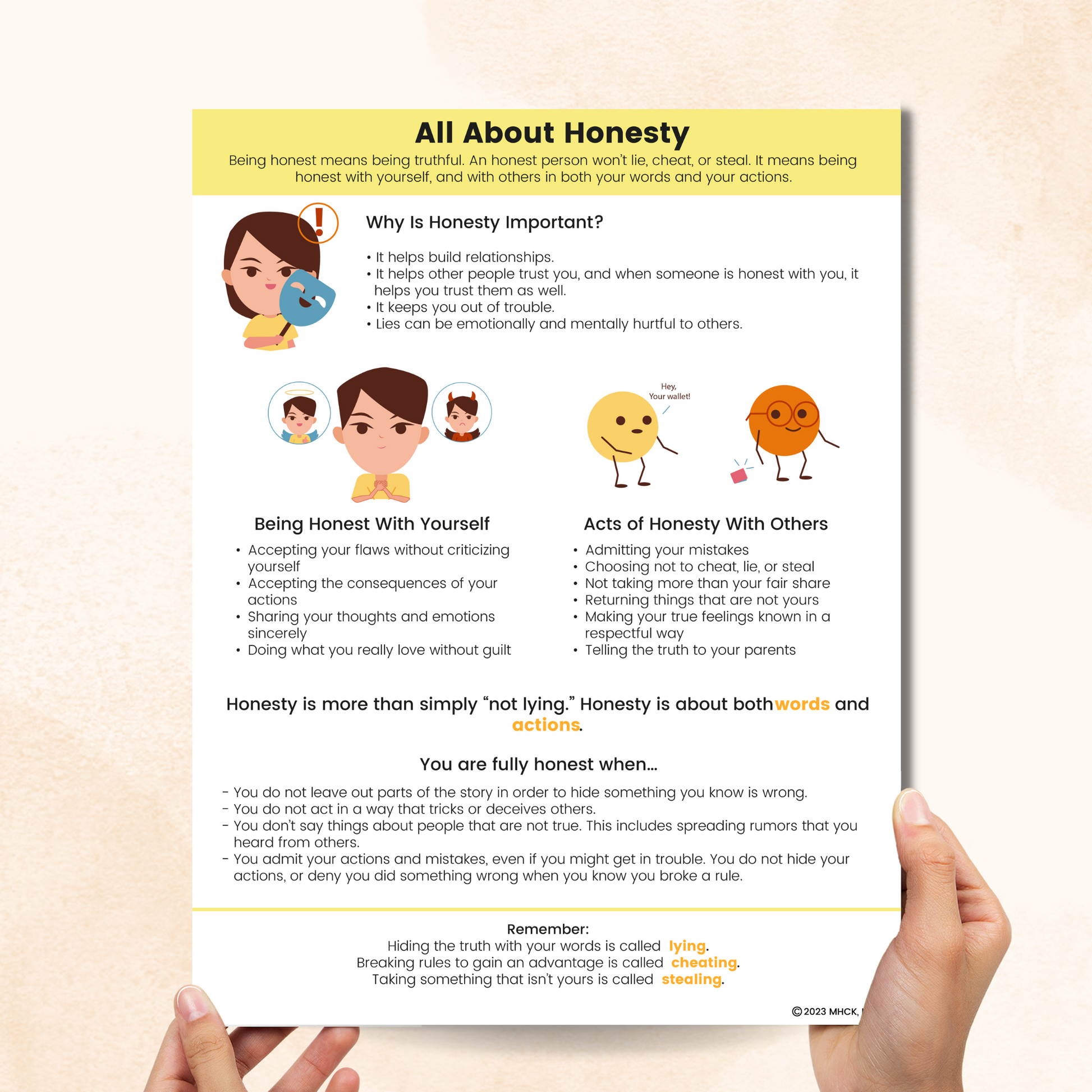 This honesty poster is a helpful tool for teaching young people to be honest. It provides clear examples of acts of honesty, such as admitting one’s mistakes. After teaching this concept, model it at home or in the classroom to encourage everyone to be honest!