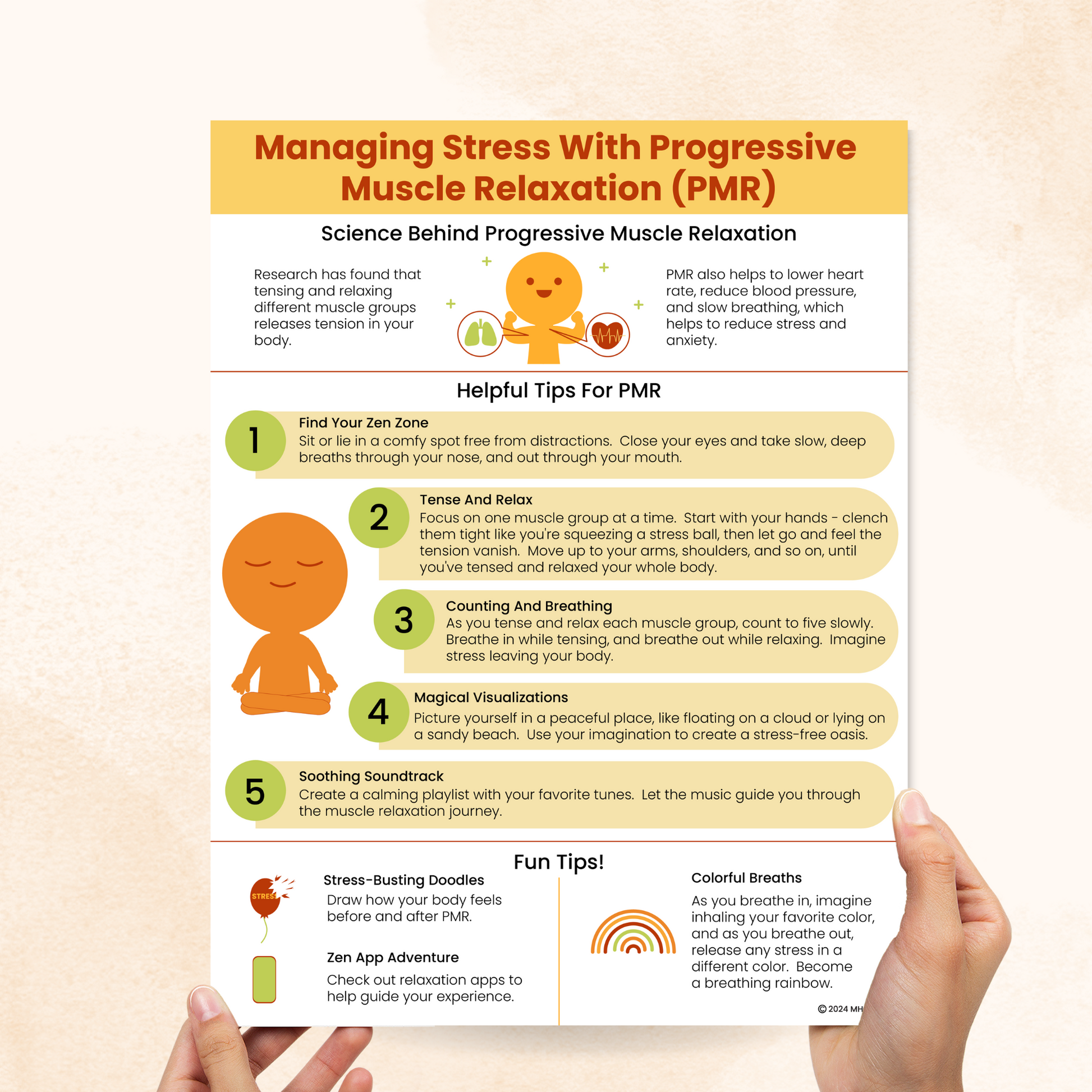 The Managing Stress With Progressive Muscle Relaxation handout serves as a beginner-friendly guide to PMR. It starts by explaining the science behind the technique, including its positive effects. Most importantly, it lists 5 helpful PMR strategies, such as finding your zen zone and creating a calming playlist.