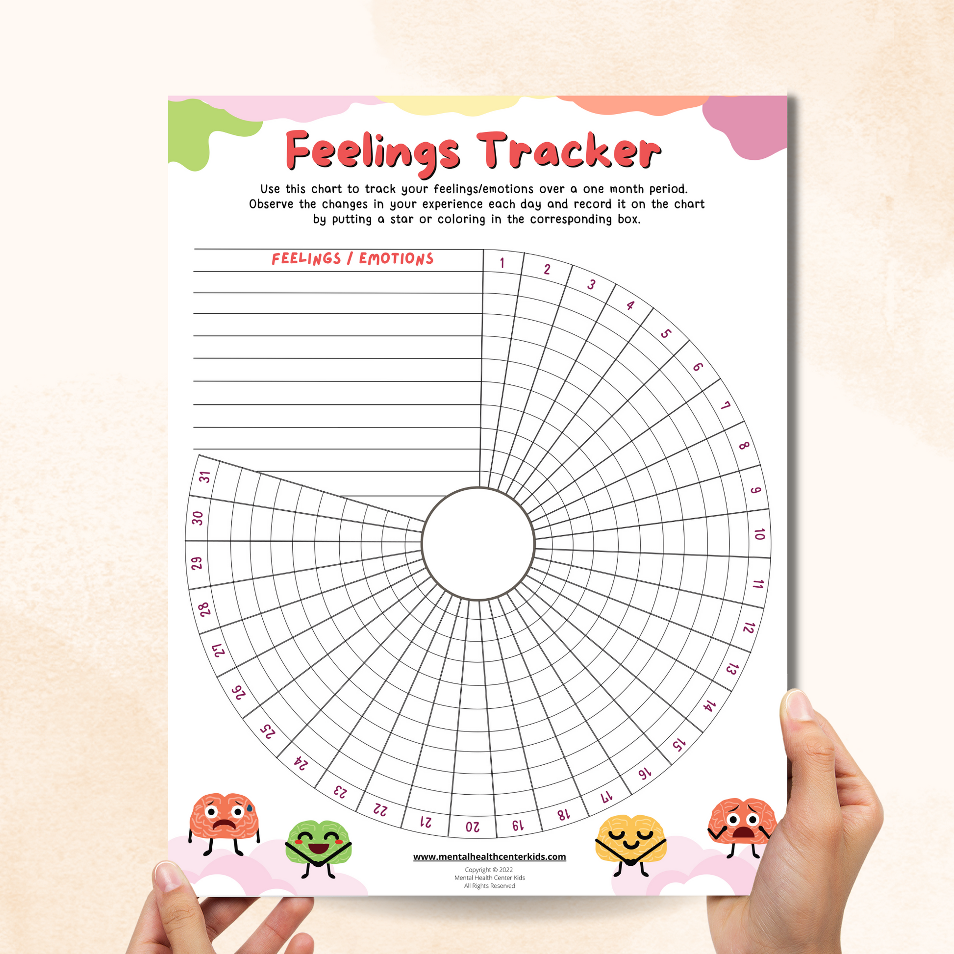The Monthly Feelings Tracker lets clients track their feelings each day for a full month by marking the corresponding boxes with a color or a star. The emotions they can choose from include mad, happy, sad, calm, worried, stressed out, and more. There is also a blank template included that allows users to list their own emotions.