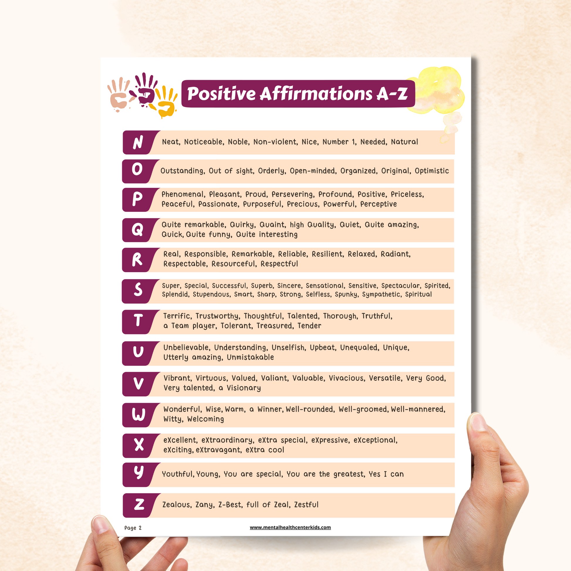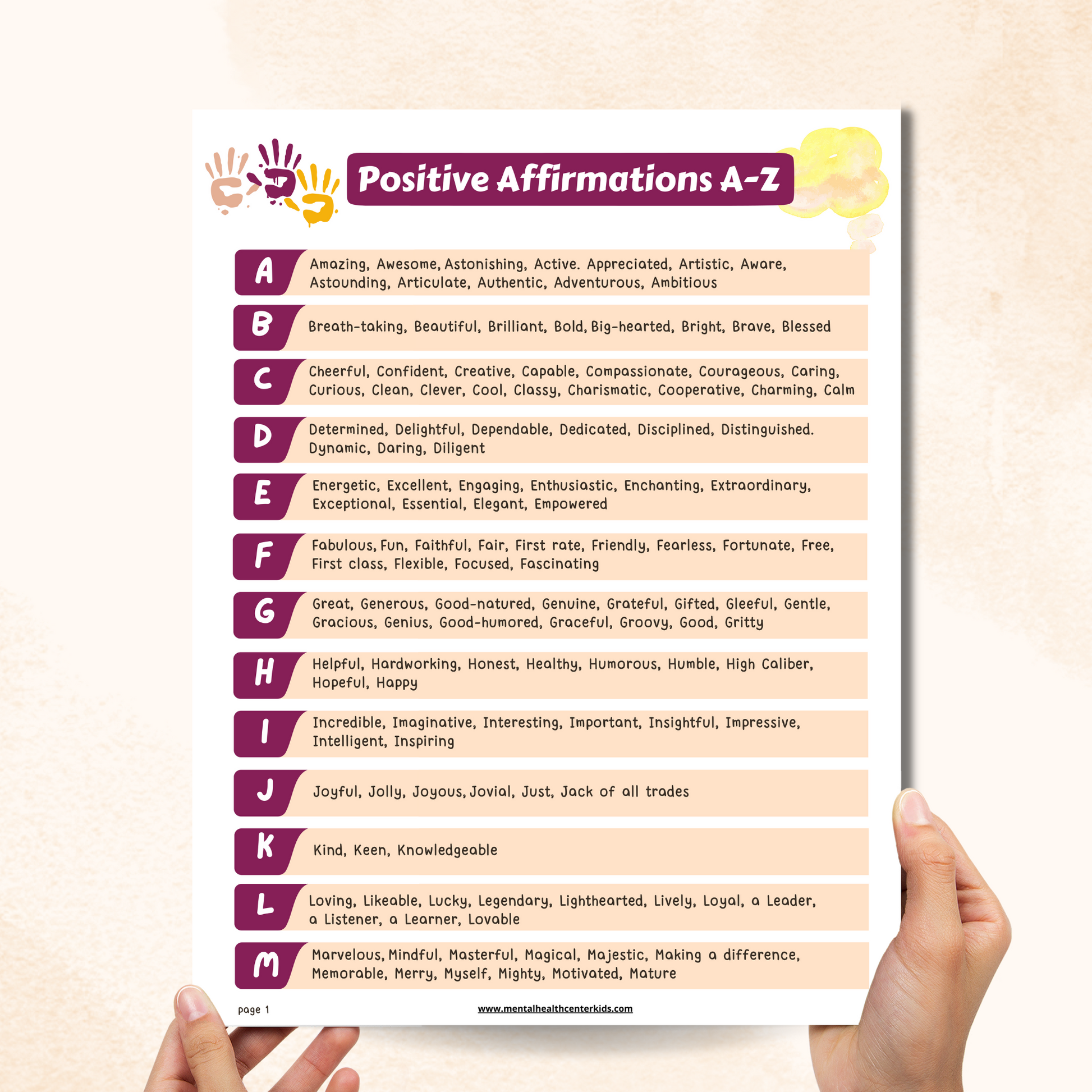 The Positive Affirmations Worksheet has a one-page worksheet where they can write their own positive affirmations about themselves starting with the phrase “I Am…,” and a two-page reference sheet with affirmations from A to Z to choose from. This extra content helps them find phrases that resonate with them and promote a positive outlook.