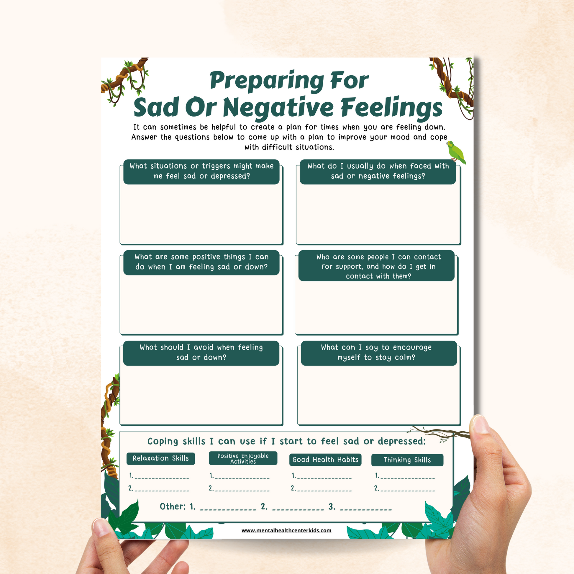 The Preparing for Sad or Negative Feelings worksheet helps young people face feelings of sadness or depression by planning ahead using simple methods. On the worksheet, they need to answer questions about triggers, positive things they can tell themselves, and ways to calm down.