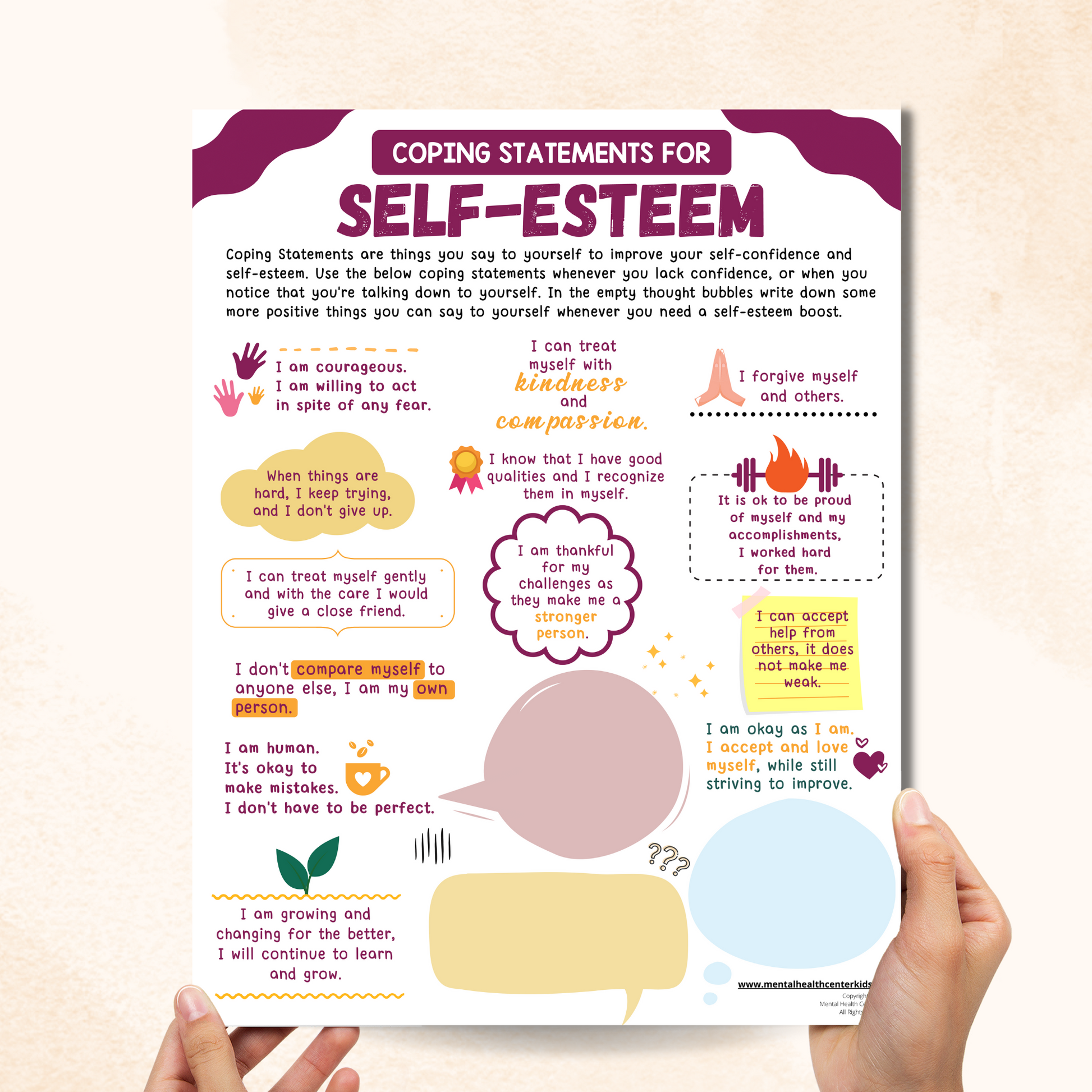 Self-esteem coping statements are positive reminders for people to overcome negative thoughts and feel more confident. These phrases reinforce self-worth and are often practiced by the person themselves or encouraged by therapists, mentors, or supportive adults.