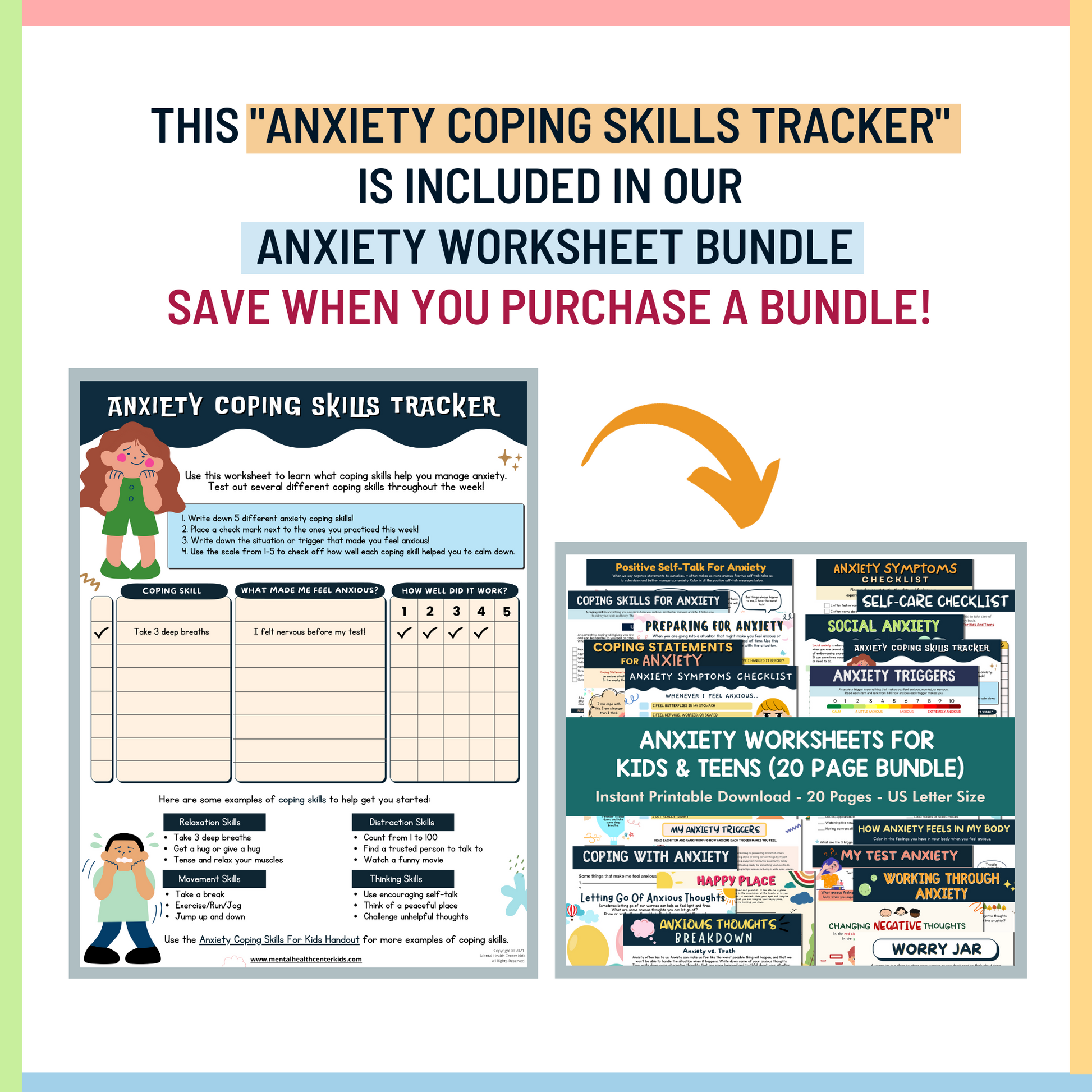 The Anxiety Coping Skills Tracker worksheet is designed for kids to track their thoughts and anxiety triggers, and try out different coping skills to handle their emotions. They can jot down the coping skills they’ve used in a situation and rate their effectiveness on a scale of 1 to 5. Examples of coping skills like Relaxation, Distraction, Movement, and Thinking are also listed for those who need ideas to get started.