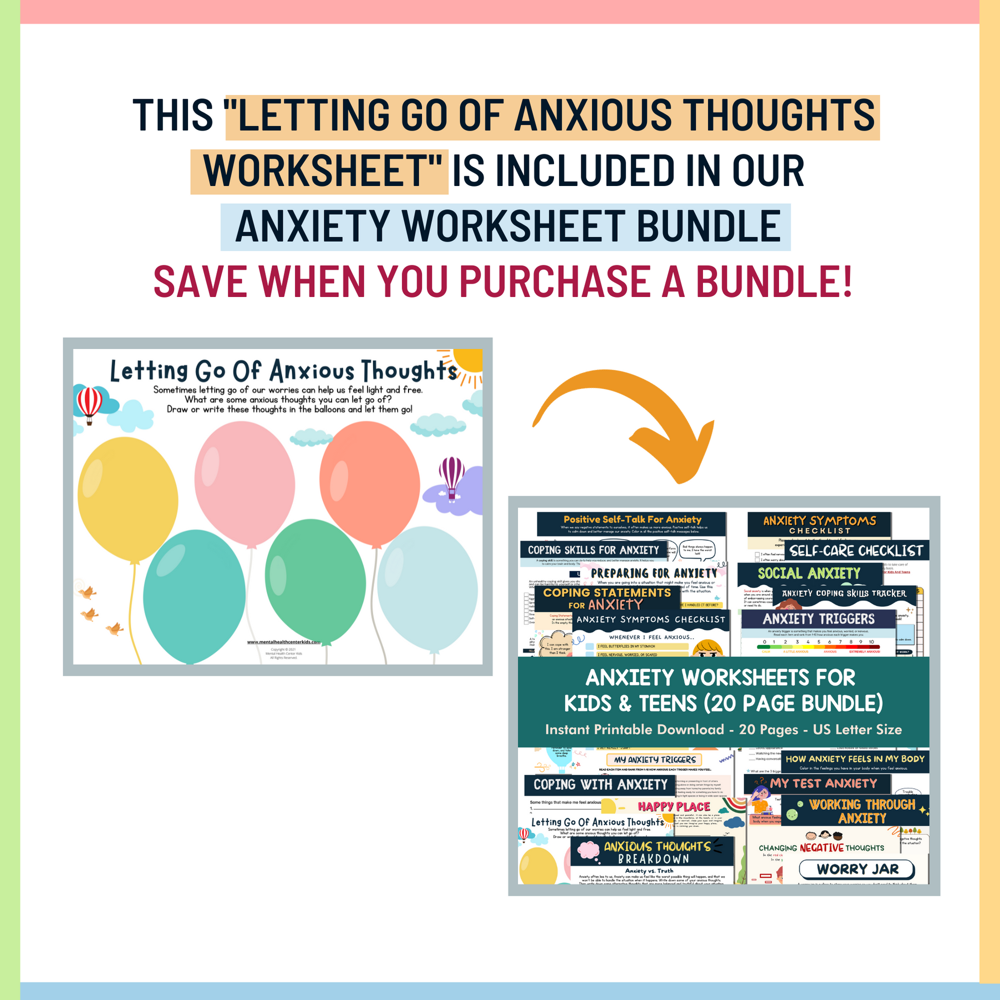 The Letting Go of Anxious Thoughts worksheet is a therapeutic tool that allows kids and teens to calm their minds and bodies by taking a mental break from the cycle of anxiety. Anytime anxious thoughts pop up, they can write them down in 6 balloons and imagine them drifting into the sky.