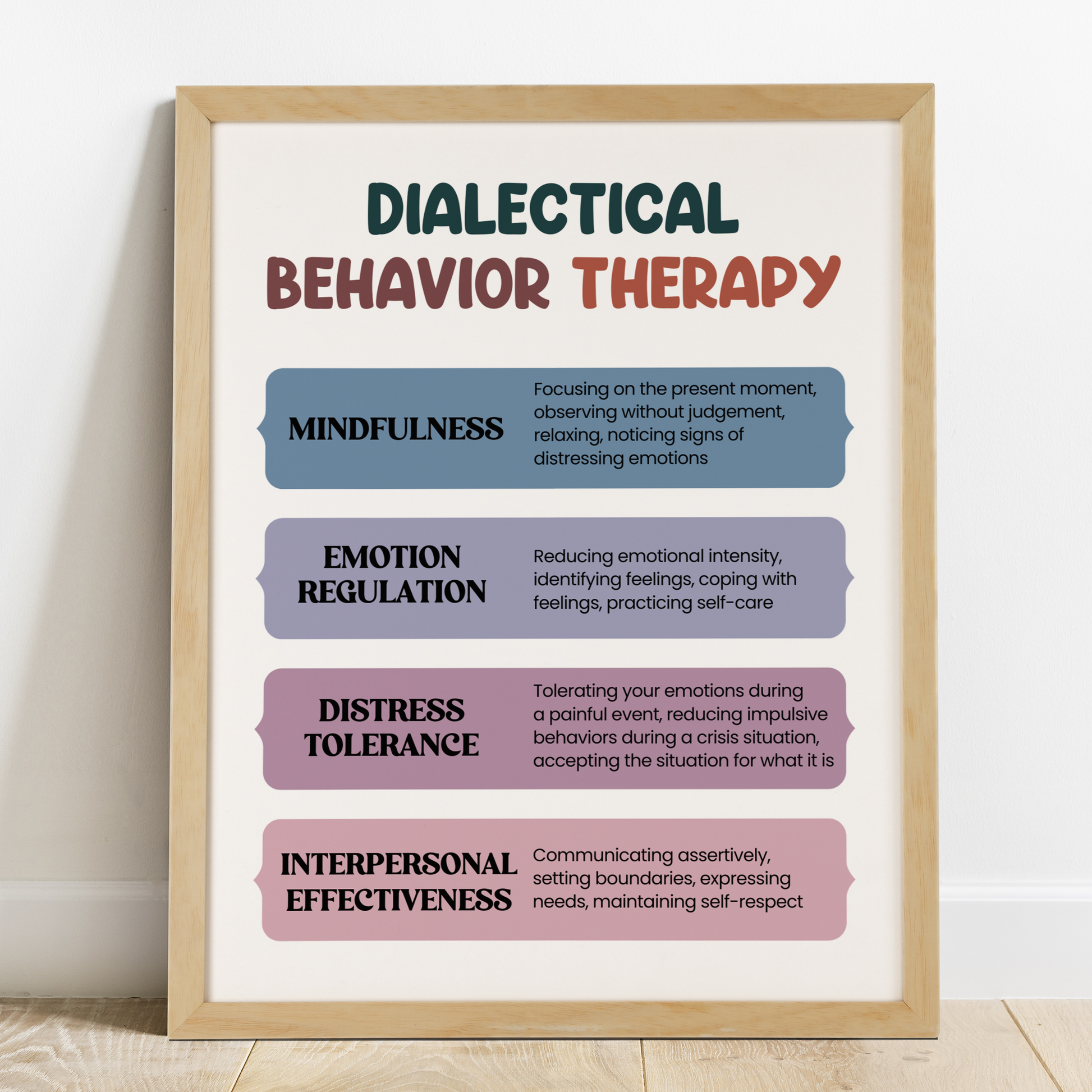 This office decor features the four main components of DBT, namely: mindfulness, emotional regulation, distress tolerance, and interpersonal effectiveness. If you offer this therapy type, feel free to print and frame it on your wall.
