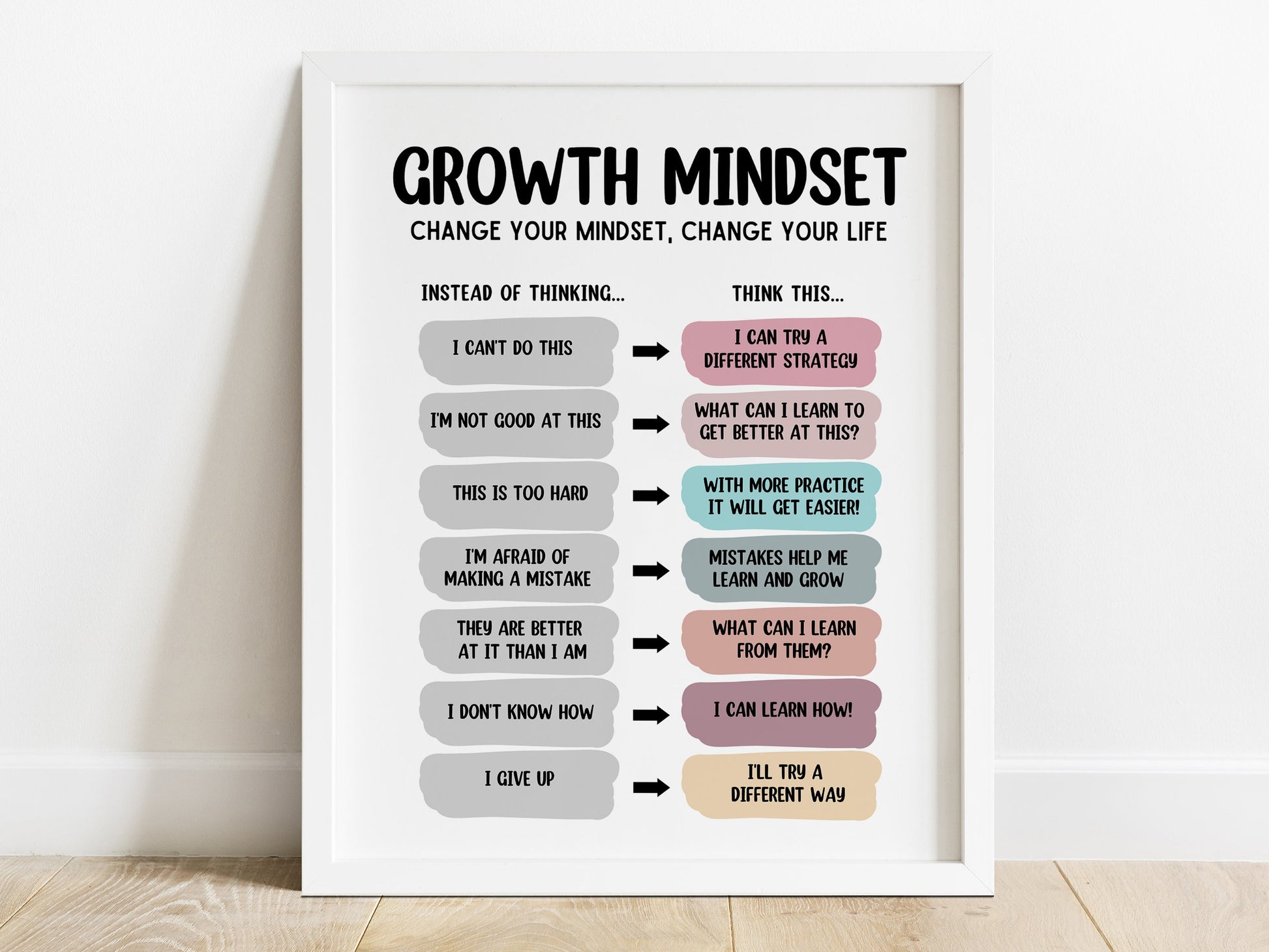 The Growth Mindset Poster works by presenting seven alternative thoughts that encourage a positive and growth-oriented attitude. Each thought challenges a fixed mindset belief. For example, instead of “I don’t know how,” the poster suggests “I can learn how!”
