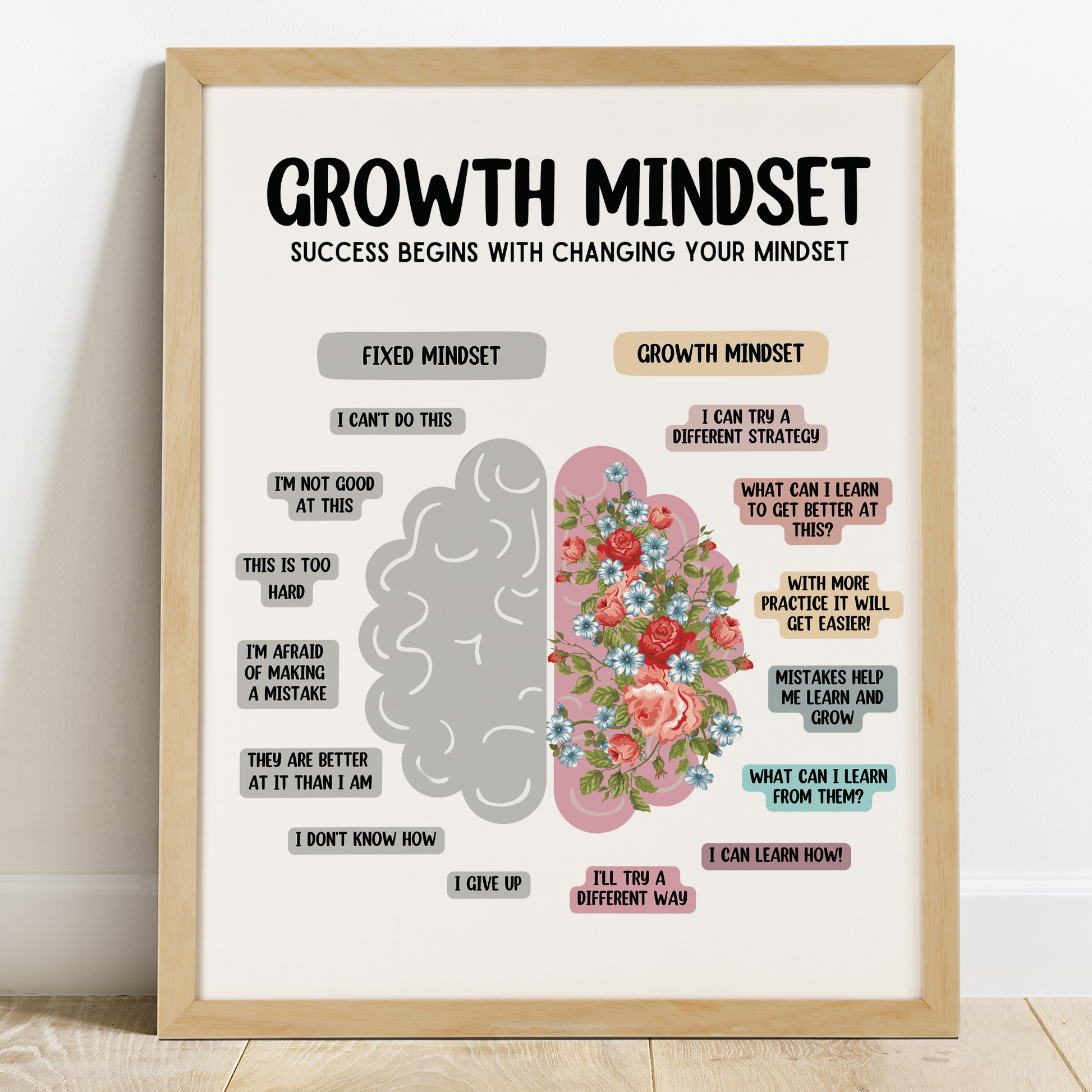 This growth mindset vs fixed mindset poster can be used as a decor and source of inspiration in therapy offices and classrooms. When discussing a growth mindset, let your child or student recite any of the growth mindset affirmations so they can feel encouraged.