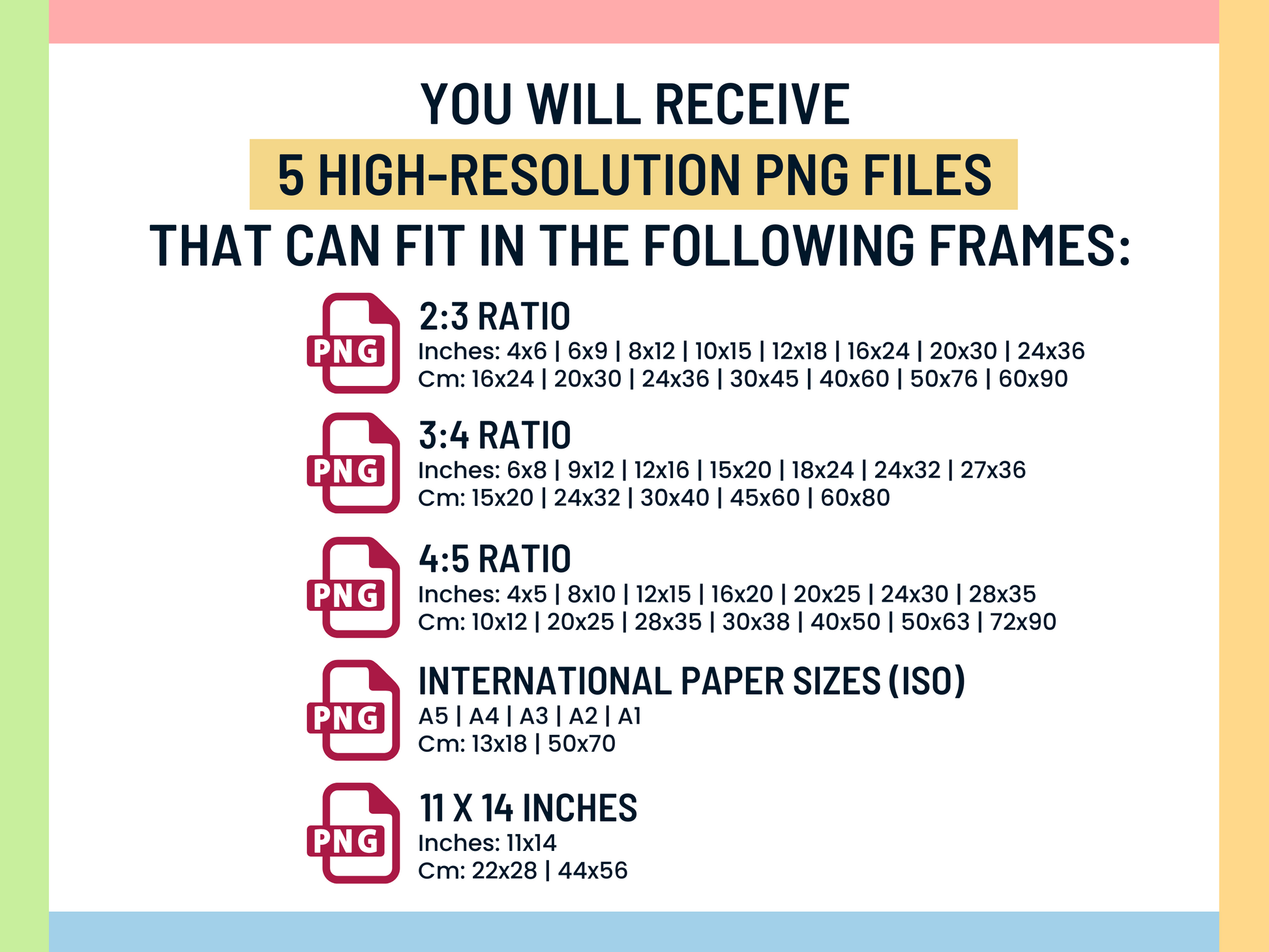 ✔️2:3 ratio file for printing: Inches: 4x6 | 6x9 | 8x12 | 10x15 | 12x18 | 16x24 | 20x30 | 24x36 Cm: 16x24 | 20x30 | 24x36 | 30x45 | 40x60 | 50x76 | 60x90 ✔️ 3:4 ratio file for printing: Inches: 6x8 | 9x12 | 12x16 | 15x20 | 18x24 | 24x32 | 27x36 Cm: 15x20 | 24x32 | 30x40 | 45x60 | 60x80 ✔️ 4:5 ratio file for printing: Inches: 4x5 | 8x10 | 11x14 | 12x15 | 16x20 | 20x25 | 28x35 Cm: 10x12 | 20x25 | 28x35 | 30x38 | 40x50 | 50x63 | 72x90 ✔️ International Paper Sizes (ISO) file for printing: A5 | A4 | A3 | A2 | A1 Cm: 13x18 | 50x70 ✔️ Separate 11"x14" file Inches: 11x14 Cm: 22x28 | 44x56