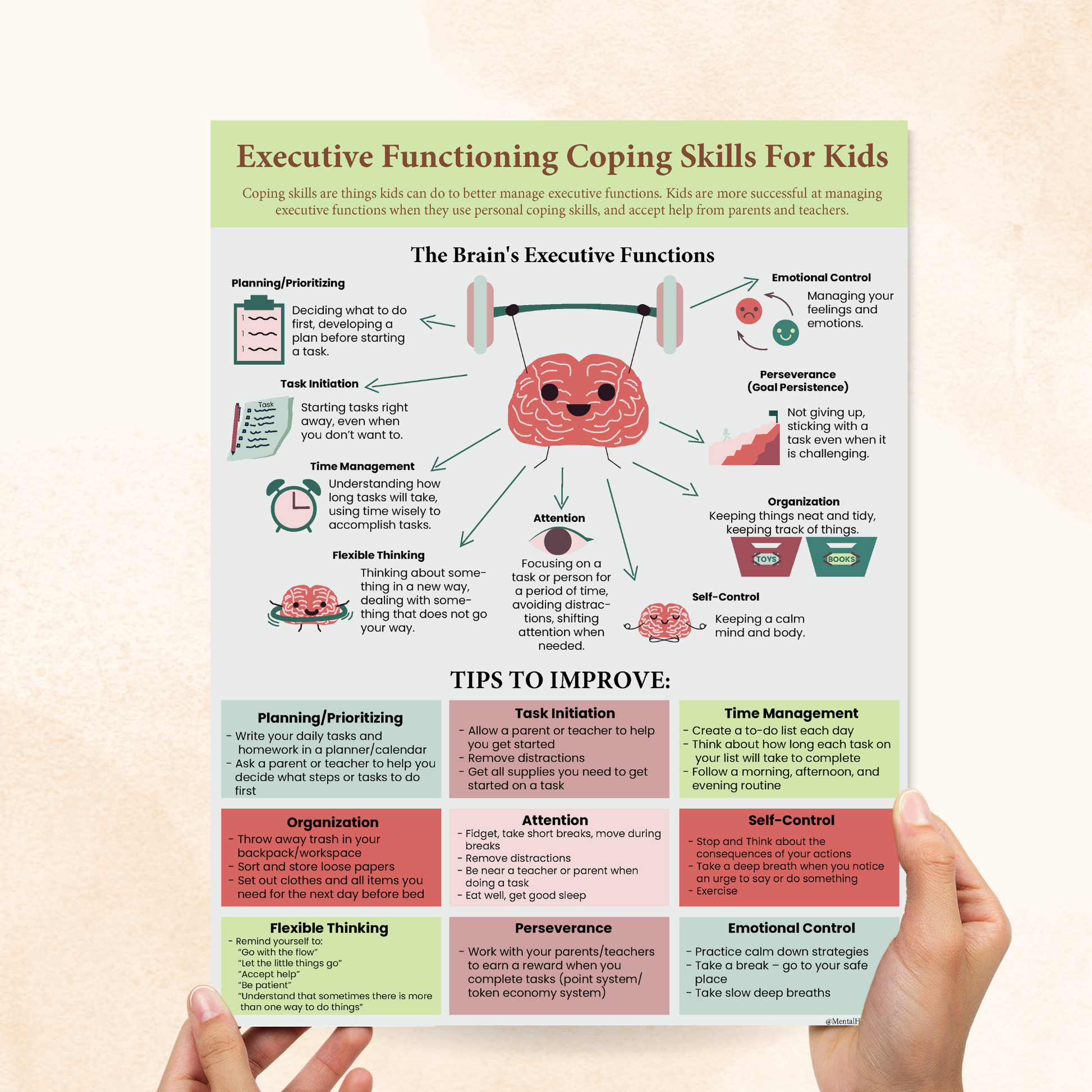 Executive functioning refers to processes that allow a person to manage themselves, focus, control their impulses, and reach their goals. Helping kids improve executive functions can be done by teaching them coping skills and letting them practice these skills.