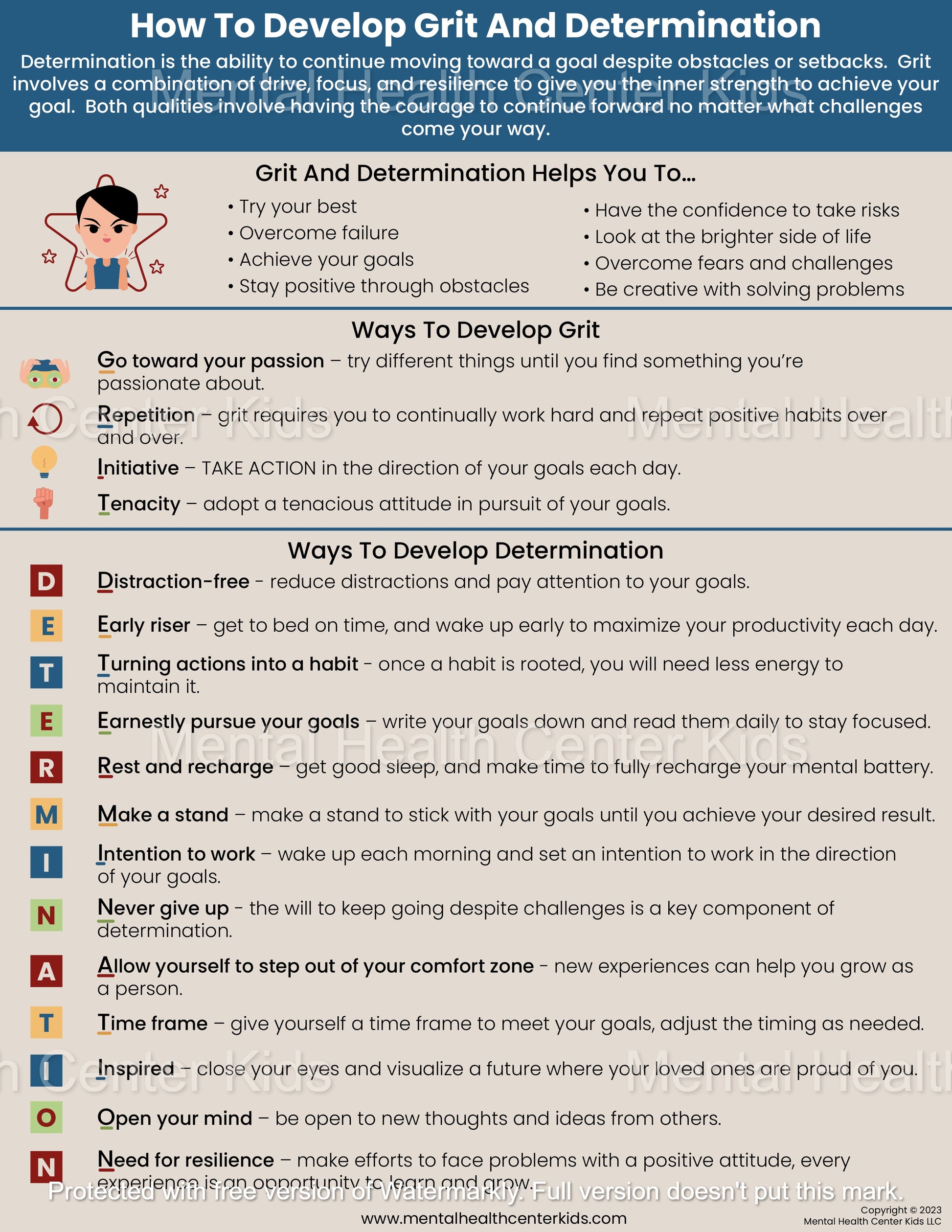 We created this handout to help foster grit and determination in kids and teens. Each letter of the words “grit” and “determination” corresponds to a positive quality or action that allows them to practice these traits. That way, they can deal with hard things and come out stronger!
