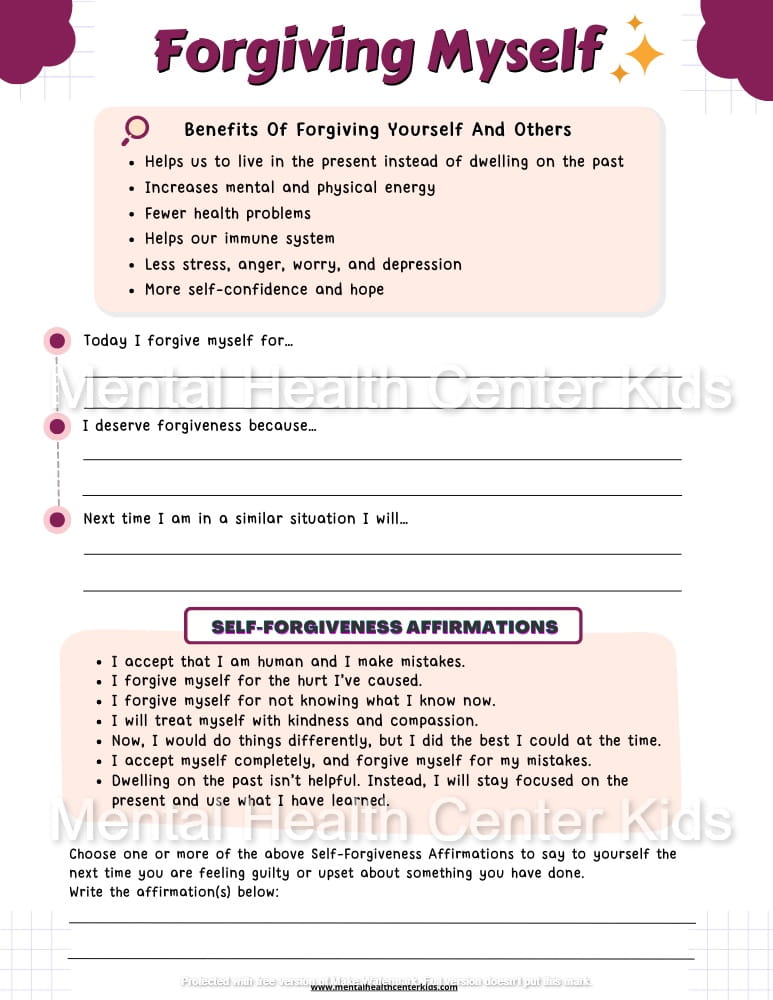 Completing this worksheet helps young people work toward self-forgiveness, which frees them from guilt and self-blame. As they go through the process, they can practice positive self-talk and seek support from trusted people.