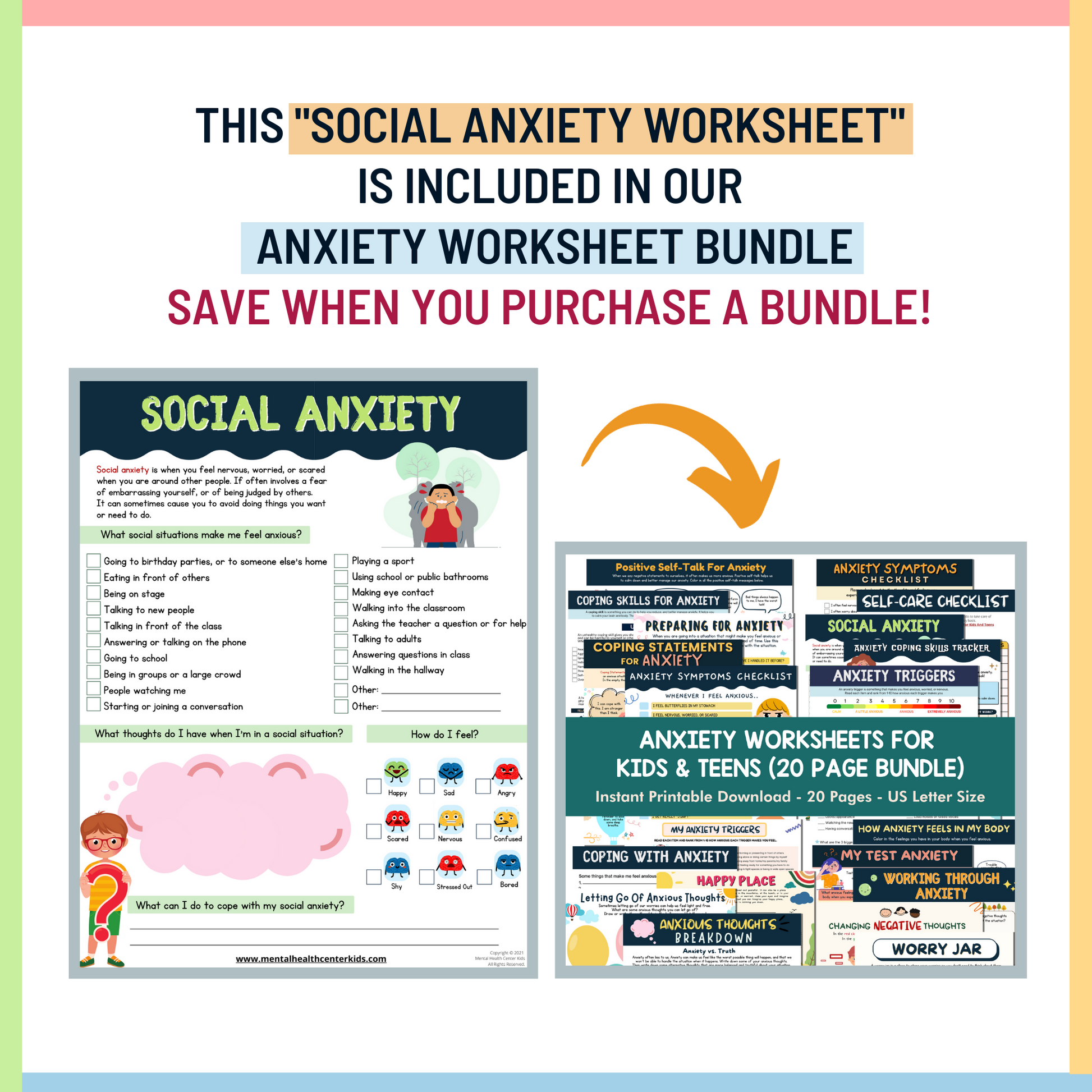 The Social Anxiety worksheet is a helpful questionnaire designed to help kids and teens assess themselves and record their thoughts during social situations. They can go through a list and pick the situations that trigger anxiety. At the bottom of the worksheet, they’ll be writing down ways to handle their social anxiety during those situations.